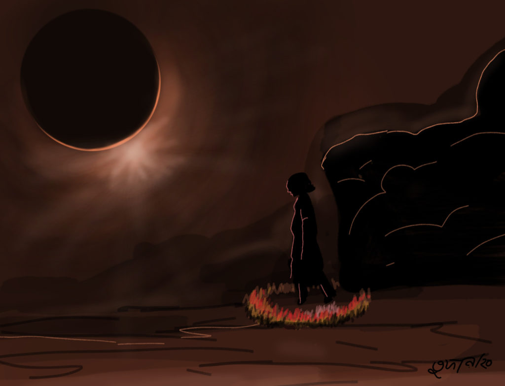 নিবা আজেফা খাৎজি বিয়ারীর পরামর্শ মত কাজ করল। পরদিন সালগ্রা অভিসারে বার হতেই এক পা-ও অগ্রসর হতে পারনা। সঙ্গে সঙ্গে পৃথিবী অন্ধকারাচ্ছন্ন হয়ে গেল।
